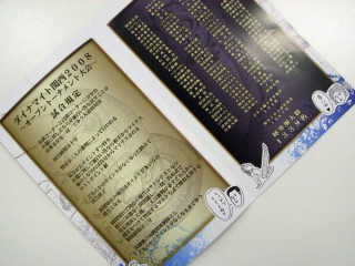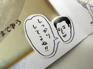 ウソの、ただいま製作中! その7 たのしかった松山取材を終えて会社に帰ってきたら、かねてより注文していた品が届いていた。 おっ! やったね! 待ってた! 『ダイナマイト関西2008』を完全収録した全413分・豪華3枚組DVDだ! ‥‥ごぞんじないかたのためにご説明しますと、『ダイナマイト関西』というのは芸人のバッファロー吾郎さんが主宰している 「大喜利王決定戦」です。 ・カッパが選挙に出馬。公約は? ・このヤンキー、ほんまはええ奴や。 そう思った理由とは? ・都内、新築、3LDKで1万円。 どうして? ・ドキュメント「日本の下着を変えた男達」 ナレーションの一節を紹介してください。 ‥‥などなどのお題に対しどれだけおもしろい答えを出せるかを競う、お笑い真剣勝負の場なのです。 今回はどんなお題が出るかな? もう早めに帰って観よーっと。 収録時間7時間ちかくあるし! と、同梱のパンフレットを見ていたら、アレ、この作風(タッチ)‥‥! こないだ会った赤ジャンの人だ! 読めば、イラストだけじゃなくてなんと「出場」もしているらしい。 しかも準決勝まで進んでるらしい。 何してるんですか、先生‥‥。 ※現在「ウソの『ただいま製作中!』」を お送りしています。 詳しくはこちらをご覧ください。 2009/02/25 15:00 |