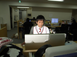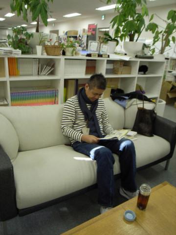 ダンディー播口がブラインドの影でしましまになって仕事をしています。 しかも、まぶしくて顔がへんになっています。 ああ、ああ、 ああ、そうね。」 シャ! (ブラインドをしめる) 楽になったわ。」 シャ! ま、まぶしい。」 シャ! (以下、なんかいか繰り返す。) と、そんなにぎやかな午後ですが、にぎやかな社員がいる会社の社長を10年やっている社長は、うるささも何処吹く風で、読書をしております。 あ、こちらのしましまは、本物のしましまですね。 2009/03/12 16:54 |