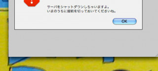 サーバメンテナンス 先ほど でも、その必要はなくなったんですって。 あー、残念。 なぜ残念かというと、うちの宇宙部は、いろんなところにしかけをしておく人たちだからです。 前回、メンテナンスタイムに突入したときに、私はこっそりサーバーにつないでいたのでした。 そうしたら写真のような警告メッセージが。 「サーバをシャットダウンしちゃいますよ。 いまのうちに接続を 切っておいてくださいね」 これはあきらかに、 怒られた‥‥。 このようなしかけがたのしみなんです。次回に期待。 2009/03/19 17:56 |