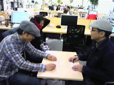 室内なのになぜかハンティング帽をかぶるふたりに習って