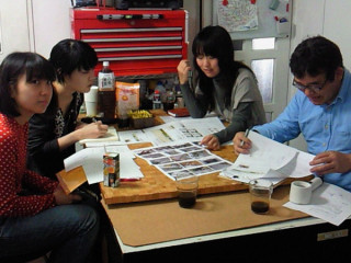 の用意したスタジオの設備概要を眼鏡&ルーペのダブルレンズで見ていた大江さん、