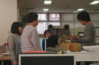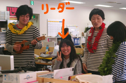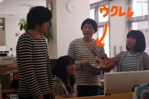 ボーダーバンド フロアのなかほどで、偶然しましまぞろいになってしまった 『やさしいタオル」のチームがウクレレ片手に打ち合わせをしています。 このウクレレは、夏の「やさしいタオル」の撮影小道具なのだそうです。 打ち合わせをしながら このようすをへええ、と撮影し、周囲とおしゃべりして気がつくといつのまにか3枚目の写真のような状態になっていました。 「やさしいタオル」のリーダー おのれがおもしろいことになっている、それに気づいてはいるけど、誰もとらない。 いいチームが築かれつつあるようです。 2009/04/07 15:35 |