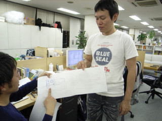 が1枚の紙を前になにごとか相談中。
