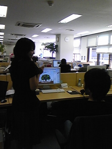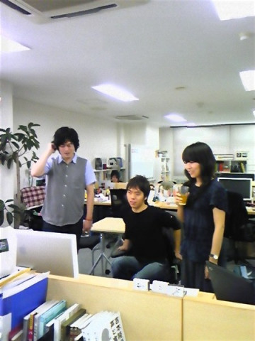 先輩デザイナーAのラフをほめながら先輩デザイナーBのラフをせかす、デザインチームの最年少