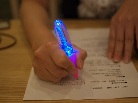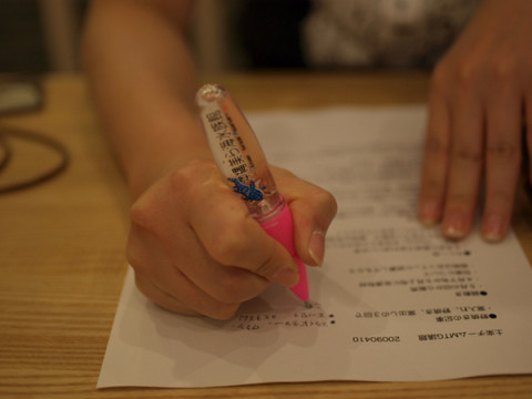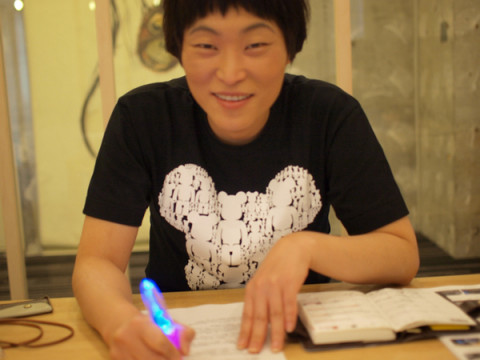 やえぼうのペン。 「やえぼう」こと 机の上が。 メモのあたりが。 ‥‥ペン? ボールペンが、光ってる? 「そうなんですー。 沖縄美ら海水族館で おみやげに買ってきた ボールペンなんですけどねー。 くじらが泳いでてかわいいなー、 って思って買ったら、 光るの! びっくり!」 こっちがびっくりですよ。 どうやら筆圧がかかるたびに光るしくみになっているようです。 「だいじなことをメモしている」 という感じは、出ますね。 ところでその土鍋まわり、本年度も、いろいろ企画してますよー。 どうぞお楽しみに! あ、また光った! 2009/04/10 23:18 |