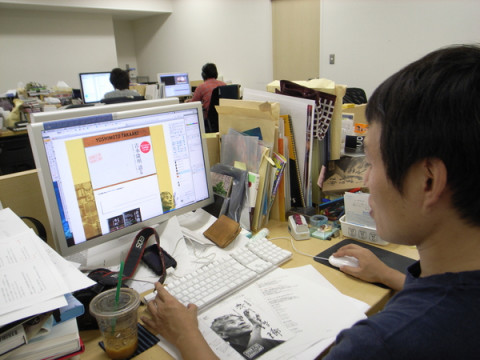 明日の準備 明日更新のこのページは、見え方はシンプルなのですが、隠れたところで構成が複雑なのです。 ぐっさんと私のペアは、わりあいお互いのボールの投げ合いがめちゃくちゃなようでいてしかし最後には本人たちも驚く着地点が出てくる、ということが多いのですが、今回ばかりは、なんとなく不安です。 ぐっさん、理解してる? この複雑なページ構成、すべてを。 「してる。いつもよりはしてるよ!」 うーん、心配。 あとでまた打ち合わせすることにします。 2009/04/13 19:38 |