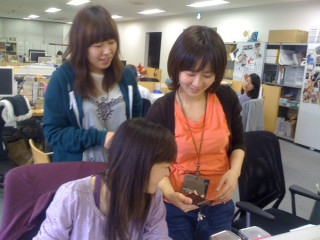 生まれたてホヤホヤの赤ちゃんの写真を覗き込む女子。
