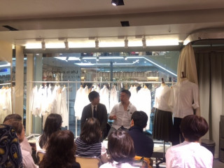 白いシャツをめぐる旅。トークショーはじまりました! 伊勢丹新宿店にて、「白いシャツをめぐる旅。」のトークショーがはじまっています! 今回は、2部構成。 第1部はヒトヨシの松岡さんが今回の「ボタンダウンシャツ」開発の裏話をしてくださっています。 衿周りが綺麗に見えるように、パターン上で細かい微調整を何度も何度も、してくださっていたそうです。 (それは知らなかった!) そのほか、素材選びで大切にされていることや、工場の裏話などもお話ししてくださっています! このあと、第2部はSTAMP AND DIARY の吉川さんとDajaの板倉さんが登場します! 2016/09/18 14:28 |