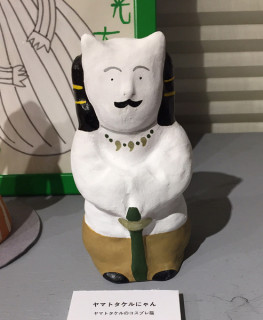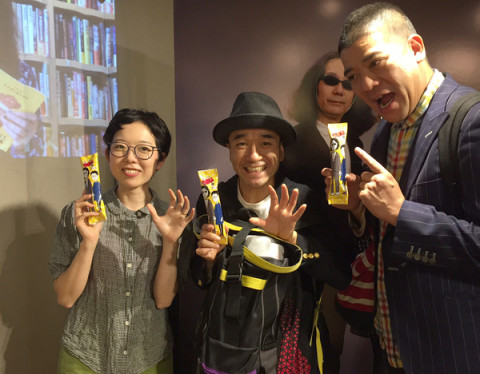 チェリー吉武さんが! 昨夜、TOBICHI2で開催中の 「親バカ小バカ展」に、あの、猫ひろしさんが、観に来てくださいました。 「観たぞ、リオデジャネイロオリンピック!」 でも、たくさんの人が応援&注目していた猫さん、どうやって、この展覧会のことを? とおうかがいすると、 「サイトを見て、知りました。」とのこと。 どうもありがとうございます! じっくり展示を観てもらったあとで、在廊中の、くどうひかりさんから、 「うまい棒」をプレゼントされて、みんなで、ニャー!ポーズで記念撮影。 (みうらじゅんさんのカンバンも うしろで、見守ってるみたい。) 猫ひろしさんと一緒に来てくださったのは、ワハハ本舗の芸人さんの、チェリー吉武さん。 顔出し看板の、目力もさすがです! チェリーさんは、猫さんの後輩芸人さんで、ギネスブックの公式記録を17個持つという、日本人最多のギネス世界記録保持者だそうです。 お尻でくるみを割る記録を、テレビで見たことある人もいるのでは。 (17個の記録が気になる方は、こちらへ。) 猫ひろしさんは、猫の人形コレクションも500体くらいお持ちだそうで、やっぱり、猫好きなんだ、と思ってたら、猫アレルギーでほんものの猫が飼えないので、とおっしゃってました。(ネタ?) くどうひかりさんの作品、 「ヤマトタケルにゃん」を見た猫さん、これもコレクションに入れたいと、お買い上げいただいて、くどうさんも、すっごく喜ばれてました。 ということで、猫さんとチェリーさんの、TOBICHI2のうれしいサプライズご来店、とてもたのしいひとときでした! 6日から始まりました「親バカ小バカ展」も本日13日(木)が最終日です。 もし行ってみたいと思ってくださってるかた、ぜひ、TOBICHI2におこしくださいね。 1階の「絵馬奉納所」で、猫さんの絵馬も見つけられるかも。 2016/10/13 11:33 |