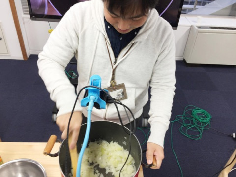 カレーの学校、実験中。 来週おこなう「カレーの学校」の第1期、3回目の授業のために、 「調理中の手元を 動画に撮って、画面でうつす」 という実験をしています。 こんどの授業テーマは 「たまねぎ炒め」。 みじん切りをするときに画面がどれだけ揺れるかや、たまねぎを鍋で炒めたときにどのくらい煙が出るか、実際の色と画面の色がどれだけ違うかなどを細かくチェックしていきました。 ついでに、せっかくたまねぎを炒めるので、 水野さんの本にあるスパイスカレーをみんなで最後まで作ってみることに。 スタッフの我々も 「カレーの学校」に関わることで、以前よりもカレー作りの知識がずっと増えている気がします。 たのしいです。 2016/10/27 17:28 |