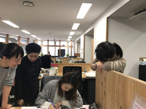 江洋さん。 このみんなに見守られて何かを書いている女性は誰かといいますと、先日からアルバイトにきてくれている江洋(jiang yang)さんです。 この春くらいから、別々に海外周りの仕事をしていた ただいま、 「ほぼ日ストア」の海外出荷むけの小冊子を英語版と中国語版で作成中です。 英語はアメリカにリンジーがいるし、わたしたちも、まあ‥‥できなくもない、なんですが、中国語となるとうっすらなので、 (勉強中ですが!) 江洋さんに手伝ってもらっています。 今日も、画像をつくるのに、手書きで、中国語で書いたり、とか、上がってきた翻訳を確認したり、活躍中でござます〜。 にわかインターナショナルな現場よりお送りいたしております。 2016/11/16 17:16 |