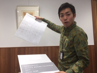 手帳チーム用のカレンダー ほぼ日手帳チームはいま、2月1日発売の4月はじまり版 「ほぼ日手帳2017 spring」発売に向けてせっせと準備をすすめています。 1月の下旬に公開予定の予告ページのスケジュールや年末年始の予定を書き込むために、先ほど、手帳チームで使っている ホワイトボードカレンダーを2017年のものに新調しました。 ほぼ日手帳チームは10人を超えるチームなので、予定がころころ変わることが多いんです。 2017年までもうすこしですね。 たのしい予定で埋められるといいなぁ。 2016/12/07 17:05 |