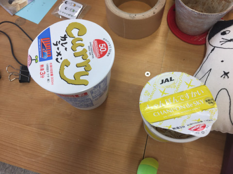 私は、おっくんの席から発見された小さなカップ麺をお昼ごはんにいただきました。