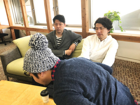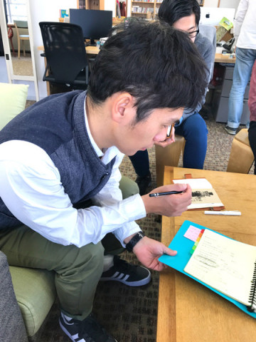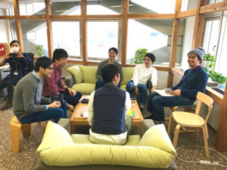 デザインチームの朝会は、いつも、窓に近いソファで行われます。