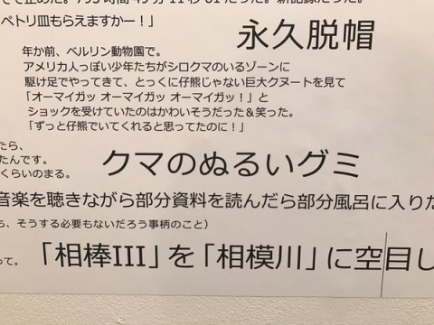 おじさん3人の展示へ。 今日から鎌倉ではじまった、おじさん3人の展覧会へ行ってきました。 ちいさいことばシリーズでイラストをお願いした漫画家、キャラクターデザイナー 青木俊直さん、MOTHER2や3でお世話になった、自称お楽しみライター戸田昭吾さん (本当は、ゲームのシナリオや、歌詞など手がけられています)、ゲーム作家でMOTHER2のドット絵を担当された大山功一さんの 「三人展」という展覧会です。 三人のおじさんの、かわいさとユーモアがいっぱいの展示でした。 戸田さんのツイートが壁いっぱいに貼られているのも見ごたえたっぷり! いちいち「ぷっ」と吹いちゃいます。 2日までやってますので、よろしければ、足を運んでみてくださいー。 ーーーーーーーーーーーーーーーーーー 三人展(青木俊直・大山功一・戸田昭吾) https://www.facebook.com/3ninten 場所:鎌倉ギャラリーヨコ会期:2017年3月29日〜4月2日 ※最終日17:00クローズ ーーーーーーーーーーーーーーーーーー 2017/03/29 16:58 |
