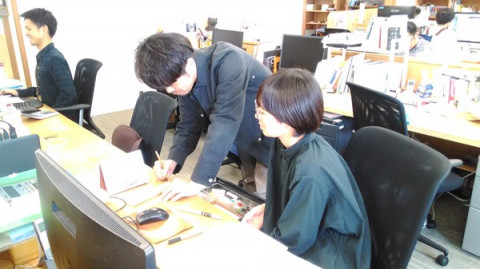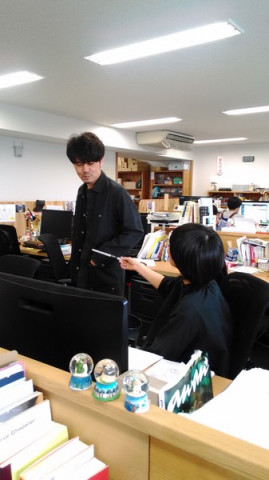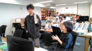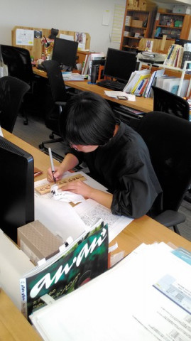 さまざまな仕事 「あの、お願いがあって‥。これに『ただいまお米栽培中』と筆ペンで書いてくれませんか。」 ジャンボは文字がきれいなので、こういう社内の文字書き依頼がちょくちょくきます。 「えーー、誰がかいてもおんなじですよ。 奥野さんが書いたらいいですよ」 (あ、そく断っちゃった。 でもその場を動かない あきらめる気はない様子・・) 「じゃあぼくが下書きを‥」といいながら板に文字の大きさを指示して、最後にビックリマークをつけてほしいと伝え、 「5分でお願いしたいのですが…」 と言い残し去っていきました。 「しょうがない、押しがつよいからなぁ。」 そして5分後、うつくしい 「ただいまお米栽培中!」の札ができました! これで、ほぼ日の今年の お米栽培がスタートします! 2017/04/06 12:29 |