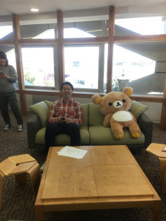 ネタを探して社内をうろうろしていると、くまと一緒に腰かけるゴッドさんに遭遇。
