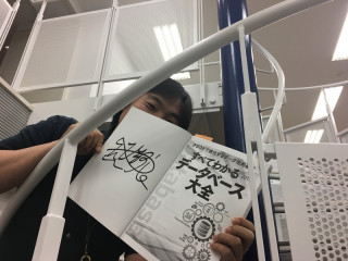 熊野さんのサイン本 先月のグルーヴノーツさん研修以来、クラウドサービスをちらちらチェックしながら業務をこなすシステムチームです。 なんと、その時の研修講師 熊野さんから、サイン本が届きました。 サイン中の熊野さんを撮影した動画付き! たいへん沸き立ったわれわれは、 「あぁ、くまさん...」の思いを込めて、サインする熊野さんの動画を見たり、サインの文字を解読したり、螺旋階段で記念撮影したりしたのでした。 くまさん、しっかり読みますからね! 本はこちらでした。 『すべてわかるデータベース大全』 2017/05/19 10:52 |