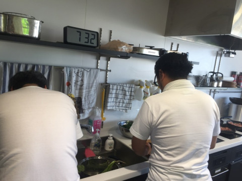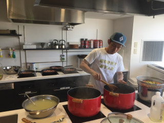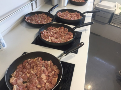 カレー作り、進んでいます! さて、水野仁輔さんとリーダーのカレー作り、どんどん進んでいます。 朝7時半ながら、キッチンはカレー作りのいい匂い。 肉もフライパンにたっぷり。 これは鶏肉‥‥チキンカレーですね。 それにしても、イベントなどでの出張料理のベテランのおふたり。 見事な手際のよさです。 少しでも役に立てたらとカレーチームの きっとおいしいに違いない。 ‥‥というか、おいしくならないわけがない! 水野さんとリーダーのカレーは、いつもすばらしくおいしいのです。 2017/06/02 07:32 |
