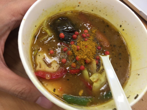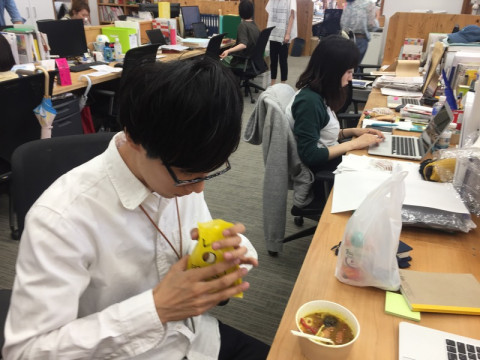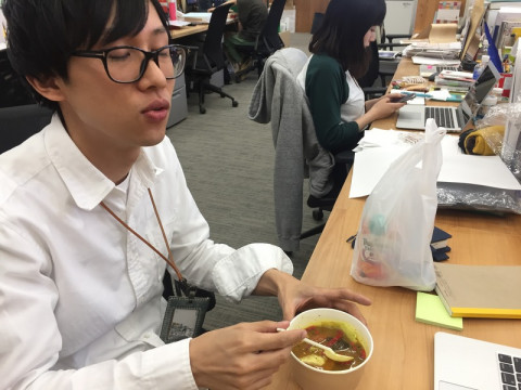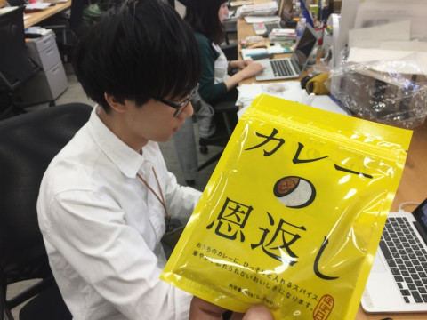 「カレーの恩返し」初体験。 すこし前に入社したばかりの もともとカレーは好きだそうで、今日のお昼はカレー。 ただ、ほぼ日のミックススパイス 「カレーの恩返し」をまだ食べたことがないということだったので、初体験してもらうことにしました。 「(じっくり覗き込んだあと) スープカレーにもいけますか?」 大丈夫です。 では、まずは入れる前の状態でカレーをひとさじ食べて‥‥。 「‥‥ふむ、ふむ。 これはこれでおいしいカレーですね」 では、すこし入れてもらって‥‥あ、ピンクペッパー、ものすごい出たね。 「いえ、いえ。美しい見た目で、ドキッとします。 ドキドキ初体験です」 じゃあ、そのドキドキのまま食べてみてもらえる? 「それでは‥‥ (ひとくち食べて)‥‥あ!」 どう、どう? 「重層感。重層感が出ます。 レイヤーが。あら、まぁ!」 レイヤーが。 「レイヤーが増えて、もともとおいしいカレーが、誰かに作ってもらったかのような味わいに」 それ、おいしいってこと? 「‥‥おいしい。 おいしい初体験です。 ふぅーーー」 ピンクペッパー、けっこう好き嫌いがわかれるけどだいじょうぶ? 「ぼくは好きですね。 さらに美しいですし」 なるほど。 じゃあ、ひとことで感想を。 「重層感ですね」 カッツミー、どうもありがとう。 のこったやつ、あげるよ。 「え、いいんですか! うれしいです。重層感」 「カレーの恩返し」を入れたカレーと入れてないカレーの食べ比べ、なかなかたのしいです。 まだ味わったことのないかた、よければぜひ、やってみてくださいね〜。 2017/06/05 13:57 |