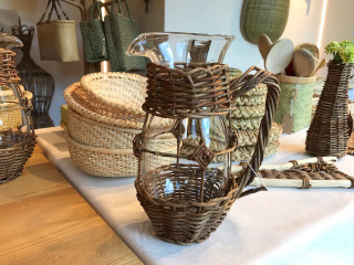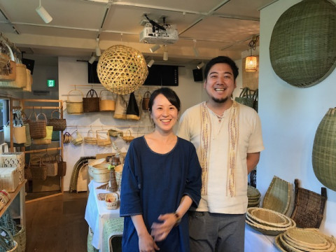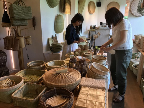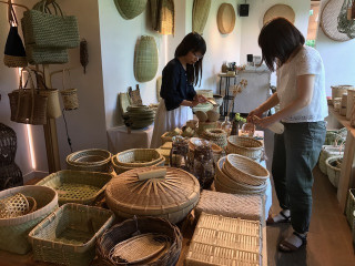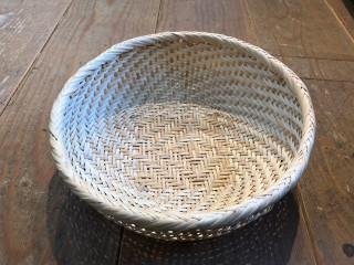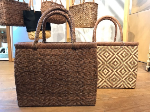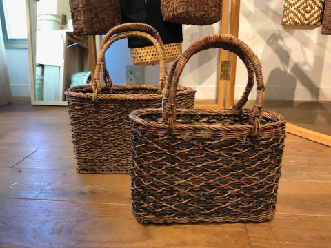 TOBICHI2で市川商店の準備完了! 明日、9日(金)11時からTOBICHI2の2階で 「たけ あけび ぶどう くるみ いぐさの かごや どうぐや 市川商店」がはじまります。 市川ご夫妻も、明日から3日間、どんなお客様がいらっしゃるか、たのしみでたまらないようです。 みなさまのお越しをお待ちしております。 ところでザルやかごをちらりとご紹介。 ザルひとつとっても定番の蕎麦用のザルから、お米を研ぐための背が高いザル、小豆洗い用のザル、またたびでつくられた白く美しいザルなどいろいろな種類があります。 めずらしいところでは、どじょうをつかまえるときのかごや、おすもうさんが土俵で塩をまくときにつかう四角い入れ物や、取っ手があけびのピッチャーなど、なかなか見かけないものがたくさんあります。 なかなか見かけないといえば、手提げかご。 ぶどう、あけび、くるみなどのバッグのなかに、あけびとくるみの木の皮を交互に使って編んだかわいいバッグがありました。 くるみの木の皮の外側を使っているバッグは、グレーがメインになっていて(写真後ろ側) 皮の内側を使っているバッグは黒に近いチャコールグレーが印象深いです(写真手前)。 かわいいちいさめのかたちに、モノトーンが入ったことで、キリッとした印象になっていました。 ちなみにこのあけびとくるみのバッグのお値段は、2万円+税です。 それから、またたびとぶどうの蔓のダイヤ柄のバッグに驚きました。 (写真後ろの白×茶のバッグ) まず、お値段にびっくりーーー。 そして、細工や編み目の丁寧さ、こまやかさ、上品なつやのよさにも驚きました。 持ったときにふわっと軽いことも驚きでした。 こういう立派なバッグに気軽に触れられる機会があることがおもしろいなあと思いました。 またたびとぶどうの蔓のバッグと同じかたちで、ぶどうの蔓だけでつくられた深い茶色のバッグもありました(写真手前)。 こちらは、実はダイヤ柄になるように編まれていて、使い始めは知っている人だけが気がつくけど、使い込んでいくとダイヤ柄が黒っぽく浮き出ててきて、それはそれは美しそうです。 ぶどう蔓は100年持つというのもすごいですね。 店主の市川さんは、いろいろな素材や作り方、作り手さんのお話もしてくださいます。 もちろん、使いかたなども教えてくださいますから、お近くにいらっしゃるかたは、ぜひ足をのばして遊びに来てくださいね。 2017/06/08 20:55 |