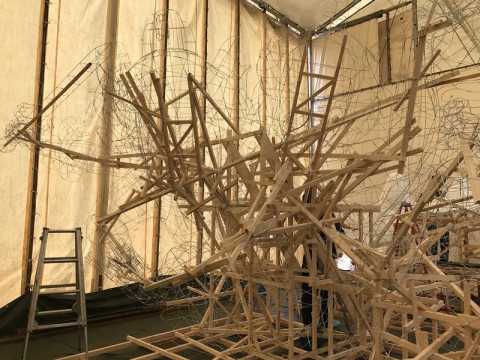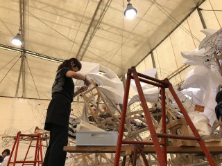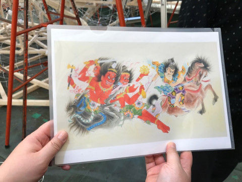 もっと途中のねぶた。 こちらも、竹浪先生の作品。 この絵を、針金と木で、3D化。 そこに、職人のみなさんが、紙を貼っていきます。 超途中! なんか、3Dのデータみたい! ひゃーーーーーっ。 すごいです。 ねぶたは、走らせるためには壊れちゃだめ。 でも、不安定さを出すことで、次の動きを想像させるから、おもしろいねぶたになる。 んだそうです。 躍動感が大事なんだなぁ。 先生の話しを聞いていたら、だんだん、ねぶたの見方がわかってきました。 2017/06/19 20:58 |