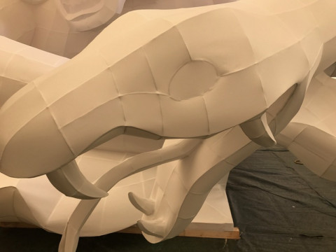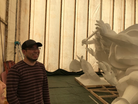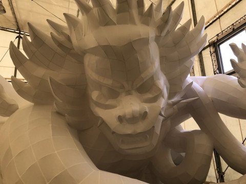 白いねぶた。 こちらは、竹浪先生のお弟子さんの手塚先生。 (ななちゃんのお母さんZIAさんのねぶた教室の先生でもあります) 手塚先生の作品は、ちょうど、紙を貼り終わったところです。 石膏像みたい。 かたそうだけど、紙です。 ZIAさん曰く、竹浪先生と、手塚先生のねぶたは、とにかくきれいなんだそうです。 筆で描いて表現する方法もあるけど、できるだけ、紙で表現していて、ちょっとした凹凸も紙で。 作り手として、作業をするひとを、飽きさせないように、と、作っているんだそうです。 単純作業の連続が、構造をうむと。 ああすごい。 竹浪先生、手塚先生、ZIAさん、ありがとうございました! ねぶたを、めちゃくちゃ堪能しました。 これが実際に街に出るところ、観たくなっちゃうなぁ。 ねぶたのイメージが変わりました。 かっこいい! 青森を堪能したので、帰りまーす。 2017/06/19 21:04 |