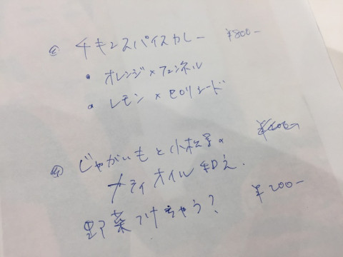 2種類のカレーが選べます! 水野仁輔さんとリーダーが来て、今日も「カレーの車」の打ち合わせ中。 早くお伝えしたいワクワクする話がいろいろ進んでいますが、まずは明日、自由が丘駅南口近くの遊歩道沿い(目黒区自由が丘1-7-5)に 「カレーの車」がオープン! (前回と同じ場所です) しかも明日はカレーを2種類から選べるという初のこころみです。 前回大好評だったチキンスパイスカレーの 「オレンジ×フェンネル」に加え、ほぼ日での試作のときに 「これもうまい!」と太鼓判を押した 「レモン×セロリシード」のカレーの2種類をお出しします。 持ち帰りもできるので、2種類買って、家族や友人と食べ比べしてもよさそう。 明日は、11時頃から14時ころまでオープンしている予定です。 みなさまのお越しをお待ちしていますー! 2017/06/22 16:10 |