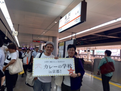 カレーの学校 in 京都!へ。 さて、さきほど「カレーの車」の販売を終えた水野さんとほぼ日カレーチーム(木内・田中)ですが、今日はこのまま京都へ向かいます。 目的は、明日明後日で開催となる、 「カレーの学校 第4期 in 京都!」 のため。 ちょうど現地で使うパネルがあったので、 「いいアイデアかも!」と思って、品川駅で持ってもらって写真を撮りました。 が、クイズ番組で京都旅行を当てたようなふしぎな写真になってしまいました‥‥。 京都での「カレーの学校」の様子もこの「ただいま製作中」ですこしご紹介できたらと思っています。 明日明後日ご参加くださるみなさん、待っててくださいねー。 いま向かっておりまーす! 2017/06/23 17:49 |