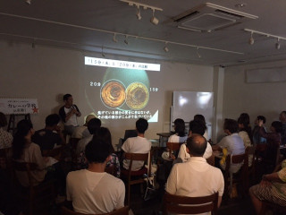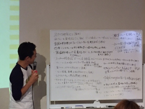 カレーの学校、大盛り上がり中! 本日の「カレーの学校第4期」は恵文社一乗寺店のイベントスペース 「コテージ」で開催中。 (恵文社のかたが、すてきな看板を作ってくださってました。うれしい!) 中の授業はというと、水野さんからどんどん飛び出す面白いカレーの話に、さっそくみなさん大盛り上がり。 たびたび大笑いが起きつつ、みなさんかぶりつきで授業をたのしんでくれています。 休み時間には、初対面の生徒さん同士でもいろいろな話が盛り上がっていて、なんだかこの場のエネルギー、すごいです。 2日間終わったら、どんな雰囲気になるんだろう? いまからとてもたのしみです。 2017/06/24 15:23 |
