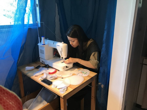 2階の海みたいな展示の奥ではカタカタカタ、とミシンをかけていらっしゃる方がいましたよ。