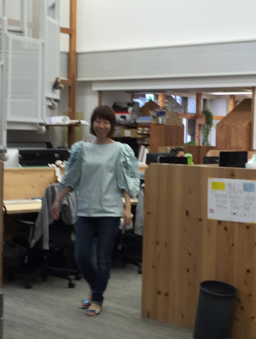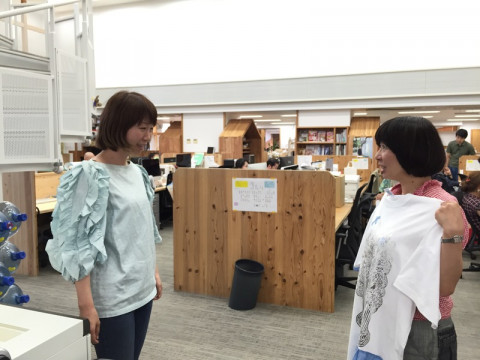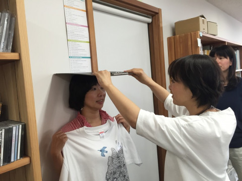 体にあてている服は、さっき、TOBICHIで買ったというひびのこづえさんのTシャツ。
