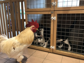 いぬとねこと、鳥男。 9月の「いぬねこなかまフェス」に向けてのコンテンツの取材です。 (今年もめちゃくちゃ豪華な出演者の方々ですよー) 看板犬のとつこは、今日も満点のかわいさで、育つか心配されていたこねこはめちゃくちゃ美人に育っていて、鳥男は‥‥あいかわらずのかっこよさ! イケメン! 鳥男のおかげで、にわとりの見方が変わりました。 あぁ、なんてかっこいいんだ! 肉球? というか、足の裏が、柔らかかったです。 正面から見ても、鳥(ちょう) かっ鳥(ちょ)いい!! みなさんにもこのかっこよさ、知ってほしいなぁ。 2017/07/18 18:02 |
