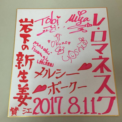 おっくんのレ・ロマネスクさん活動 8月12日の早朝、1枚の写真が送られてきました。 ん? なんだろう‥‥? ピンクの文字で書かれた、サイン? あ、レ・ロマネスクさんだ。 そこにメッセージが添えられていました。 「奥野さんのサインができました」 同僚の、私の隣の席の、 あの日から、ギタリストになったおっくん。 夏休みに、こんなライブ活動をしとったんかーい! (前もって教えてよ!!) 写真を見ると、ライブはすごい盛り上がりを見せたようで、 (ちなみに昨日のライブは、岩下の新生姜ミュージアムで行われたのですが、観客動員数が歴代トップだったそうです!) そこにごくあたりまえのように、ギターを掻き鳴らす同僚がおさまっています。 「何やっとるねん」という気持ちと誇らしい気持ちでいっぱいになりました。 サインも味わい深いし‥‥。 おっくんからは何の告知もありませんが、おそらく下記ライブでも彼はギターを弾くとようです。 レ・ロマネスクさんライブ11/18(土)東京上野 グランドリサイタル2017秋 くわしくは、 レ・ロマネスクさんのサイトをごらんください。 2017/08/12 09:59 |