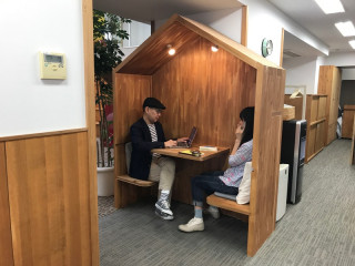 通り道に何気なくある二人で打ち合わせもできるしちょっと集中したいときはひとりで作業もできるというスペースです。