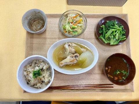鳥とたまねぎのさっぱり煮、そしてきのこごはんです。