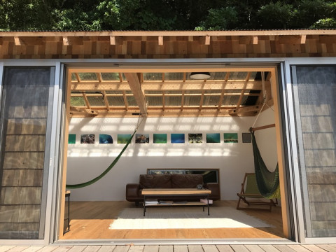 海へ。 さらに階段を降りると‥‥海! きれいです。 すばらしい景色。 ‥‥それにしても今日もまたちょうどいい天気‥‥。 昨日まで雨だったそうです。 で、たどり着いたのは、シーカヤックなどをたのしめるボートハウスのような建物。 これも亀山さんがつくった場所です。 サイコーではないでしょうか。 ハンモックのある部屋からの眺めがこんななんですよー! セミの声が聞こえます。 ぎりぎり、夏。 もっと夏にまた、ここに来たいと思いました。 さ、増田さんのツリーハウスに行きましょー。 2017/09/09 14:14 |