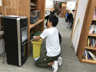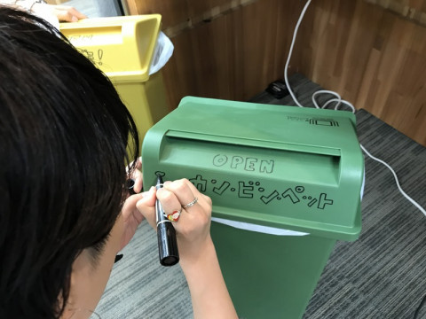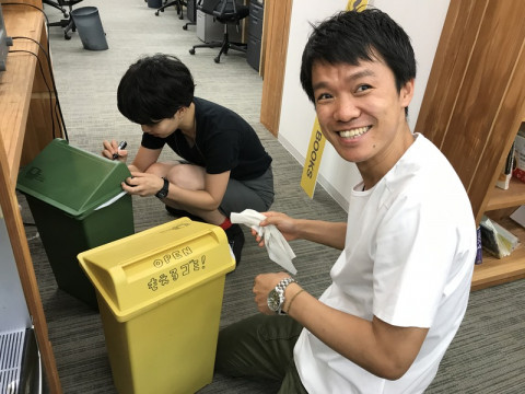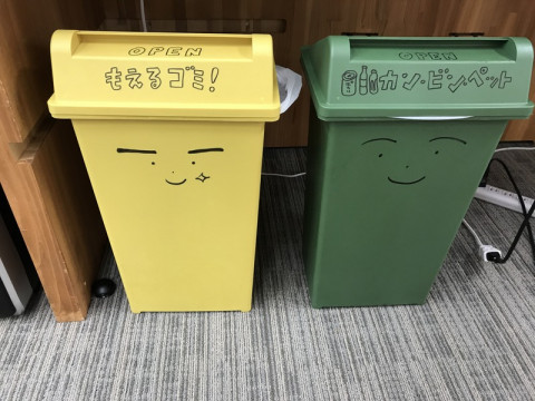 活躍させ隊 最近、オフィスで働く人たちの人数が増えたからか、蒸し暑かったからか、フロアのゴミ箱が (とくにペットボトル入れのほう) 夕方になるといっぱいになる傾向がありました。 一日の終わりに、みんながギューと無理やり押し込んでいる、そんな嘆かわしい様子を見て立ち上がったのがこのふたり 「棚の下のこのごみ箱があんまり活用されてないんですよ。 だからみんなひとつの箱に集中しちゃう」 手先の器用な これで表裏もわかりやすい。 すごい! 存在感が増した! しかも「もえる」ほうはやる気も「もえて」いる! 2017/09/28 11:31 |