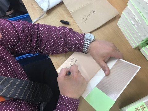 作家浅生鴨さんのサイン 13日からのTOBICHIイベントドコノコブックフェアのために、浅生鴨さんが、サイン本を作ってくださいました! 筆ペンで、さささっと。 なんか、かっこいい! TOBICHIで浅生鴨さんの「猫たちの色メガネ」を購入してくださった方へは、このために書きおろした1篇をおまけでつけてくださるそうです! その、予定です。間に合うのか‥‥? がんばれ鴨さん! 沖昌之さんの写真展と、犬猫本のブックフェア、13-22日です。 ぜひいらしてくださいましー。 イベントはこちらです! =========== 『必死すぎるネコ』『猫たちの色メガネ』出版記念イベントTOBICHI 秋のネコ祭り 期間:2017年10月13日(金)〜10月22日(木) 場所:TOBICHI2 時間:11:00〜19:00 2017/10/10 14:36 |