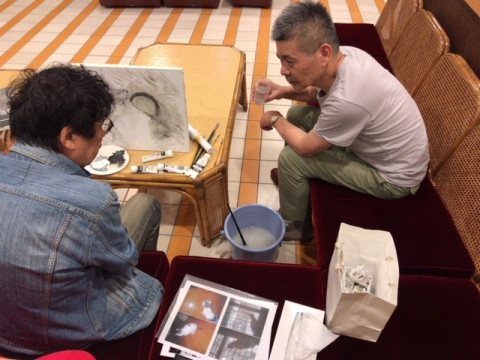 となりで卓球大会が開かれていて、わたしもすでに2試合やりましたが、その横で絵を描く横尾さん、おしゃべりする糸井。
