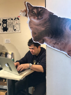 鴨店長は、寝転がった猫の向こう側で真剣な顔でお仕事をしています。