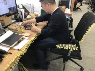 ただいま内職中。 これは何をしているかというと 「生活のたのしみ展」の チェコからきた雑貨の店の商品のピンバッチ(?)を台紙にとめているところでした。 私も昨日、「スソアキコの帽子の店」用のバーコードシールをタグにぺたぺたと延々と貼り続けました。 準備をしていると、 「あれ? これ作業が膨大だなあ。 だれがやるんだろう?」 と思うことがあるわけですが、もちろん、ただいまほぼ全員が自分の仕事に集中している時期なので、助けは呼べず、結局 「あ、自分か。」 と、納得をし、一番効率の良い方法などを試行錯誤しながら作業をすすめるのです。 2017/11/09 10:55 |