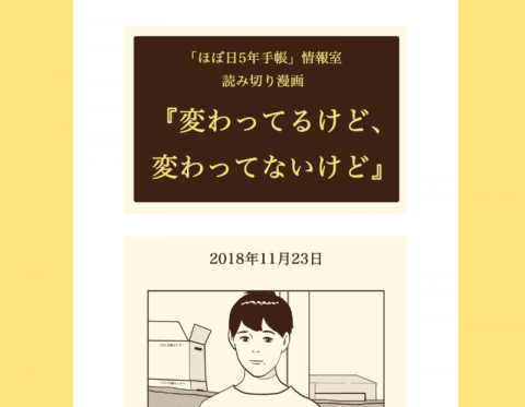 毎日更新中! ほぼ日5年手帳の公式ページOPENから、早いもので10日がたちました。 このページの真ん中あたりに 「ほぼ日5年手帳情報室」 という小窓があります。 よく聞かれる質問やおまけ、ちょっとした裏話、おすすめのペンのことなど、5年手帳にまつわるちいさな情報を12月1日(金)の発売日まで毎日更新しています。 そして、本日の記事は 『変わってるけど、変わってないけど』。 2018年から5年間の 「勤労感謝の日」定点観測漫画です。 5年手帳にまつわることなら記事の内容は自由、というコンセプトなのですが、まさか漫画を描くひとがいるなんて思わなかったなあ‥‥。 よければご覧ください! 2017/11/23 16:54 |