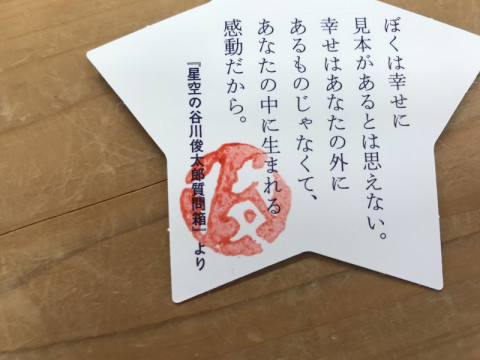 俊太郎スタンプ 東京オペラシティアートギャラリーから戻ってきたスガノです。 『星空の谷川俊太郎質問箱』ほぼ日ストア特典の 「ことばつき星空のキラキラしおり」のなかにランダムでまじる谷川俊太郎さんが捺したスタンプつきをゲットしてまいりました。 しおりは最初の入荷の1000冊につきます。 そのなかの100個がスタンプつきです。 「俊」マークは谷川さんの手捺しなので、ときどき欠けていたり傾いたりしていますが、スタンプつきがあたった方は、それも味わいと思ってください! 「ことばつき星空のキラキラしおり」が購入特典として本に着くのは、下記の売り場です。 1月13日(土)〜 ・東京オペラシティアートギャラリー ギャラリーショップ 1月18日(木)〜 ・WEBのほぼ日ストア ・TOBICHI 各店舗ごとに数に限りがありますので、しおりをご希望の方はお早めにお買い求めください。 2018/01/11 20:19 |