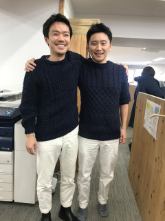 ネイビーのセーターにオフ白のパンツににたような背格好に、髪型。