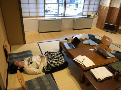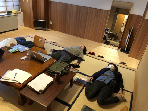 変なミーティング さきほど和室でミーティングでした。 ひさしぶりの和室ミーティング、なんだか気分がほぐれます。 さらに、わりとゆるめのアイデア出しのミーティングだったもので、ついつい話題がそれて、 「からだの柔らかさ」の話に。 みんなが次々と畳の上に、両足を折り曲げて寝転びはじめ、 「我々はいったいいま、何をしているのだろうか‥‥」 という気分になりました。 (とはいえそのあと何事もなかったように、ちゃんとミーティングをしました) 2018/01/26 18:41 |