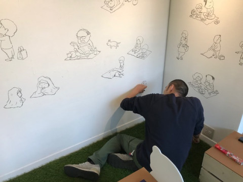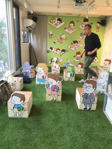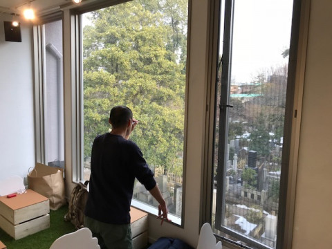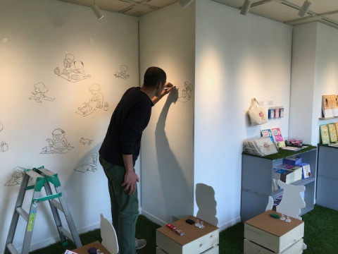 TOBICHI2の設営にいらしたヨシタケシンスケさんは、予定していた壁を越えて、隣の壁や、なんと窓にも絵を描くことに。