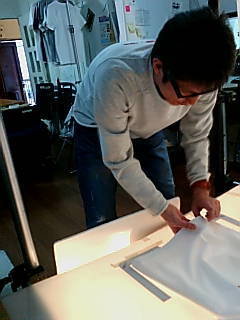 「しわ師」のわざ。 Tシャツチームの 撮影用の台のうえで、Tシャツをいい雰囲気にレイアウトするハリー。 なんでも、「しわ」を寄せることで、かっこよく見えるようにしているそうです。 一部の世界では、彼のようなひとのことを 「しわ師」と呼ぶとか呼ばないとか。 たぶん日本で唯一の存在かとおもわれます。 (すくなくとも、 わたしはほかに出会ったことがないです) 現在、そんな「しわ師」といっしょに販売ページの準備をすすめています。 ことしのTシャツ、 「しわ師」の作品公開ともども、たのしみにしていただければうれしいですー。 2009/05/14 13:59 |