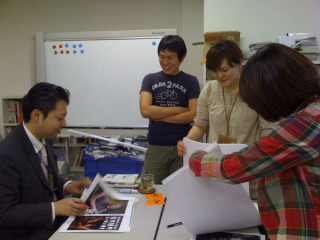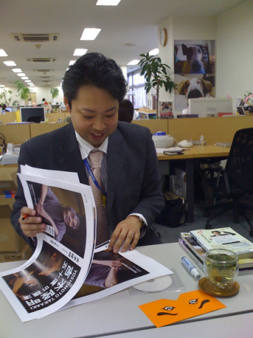 スーツさん、いらっしゃーい。 おわかりだとは思いますが、弊社にはスーツを着ているひとは、ごく少数です。 ちかごろ主には笠井さんのみ。 のはずが、今日はカフェテーブルに新たなスーツさんが、座っています。 スーツさん、いらっしゃぁ〜い。 おなじみ凸版の藤井さんでした。 お、初夏仕様で、頭がさっぱりしていて、いいですね。 さきほど、こうちゃんがやっていた、つけあわせ後の状態が、現在、藤井さんに入稿されているわけですね。 吉本チームとのムードも、なごやかなようで、よかったよかった。 藤井さん、よろしくおねがいしまっすぅ〜。 2009/05/15 17:47 |