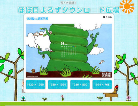 はじまりました! が。 本日の東京はすがすがしく晴れ渡っております! みなさんこんにちは。 今日から 「ほぼ日 よろずダウンロード広場」 が始まりました。 いろんなコンテンツの壁紙が、月1でめくるめくかわっていきます。 どうぞご利用くださいね! と、言いながら、お詫びがございます。 「谷川俊太郎質問箱」 「LIFE」 「ブイヨンの気持ち。」 「ネコが出ますよ。」 の4つの壁紙のカレンダーの曜日がまつがっておりました! 大変申し訳ございません! 11時の更新から11時40分までの間にダウンロードしていただいた場合、曜日がまつがっているかと思われます。 大変お手数ですが、もう一度ダウンロードしていただけると、たいへんありがたいです。 な、なにとぞ! ダウンロードはこちらから 「ほぼ日 よろずダウンロード広場」 2009/05/25 11:46 |